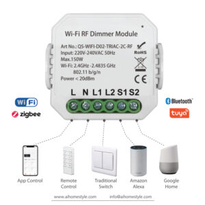 Aihomestyle 2 channel/gang Wi-Fi Triac switch dimmer controls two or two group of lamps or lights of Trailing edge dimming On-Off and adjust their brightness level via smartphone Tuya App.